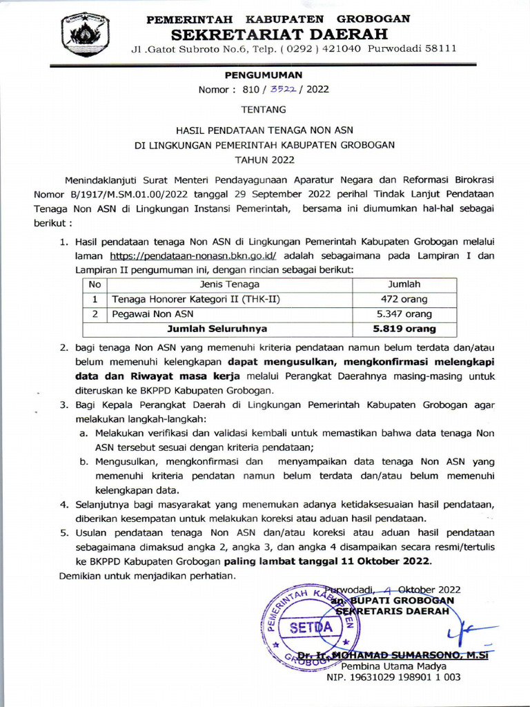 Ia menyebut jumlah THL non database BKN di Pemkab Grobogan mencapai sekitar 1.023 orang yang tersebar di berbagai organisasi perangkat daerah. Sekda menilai para THL tersebut bukan tenaga baru, melainkan pekerja lama yang selama ini menopang pelayanan publik di lingkungan Pemkab Grobogan. Karena itu, Pemkab Grobogan berkomitmen mencari celah regulasi agar THL tidak kehilangan mata pencaharian akibat perubahan kebijakan pusat.
